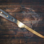 A fillet knife is a specialized tool for preparing fish, designed for precision filleting and skinning. It features a long, thin, flexible blade, made of CPM-154 high-carbon steel to handle wet conditions. The razor-sharp, slightly curved edge allows for smooth, clean cuts along bones and under skin, minimizing waste. The ergonomic handle, often rubber or textured synthetic, ensures a non-slip grip for safety. Ideal for fish but also used for delicate meats, its flexibility aids in maneuvering around bones.